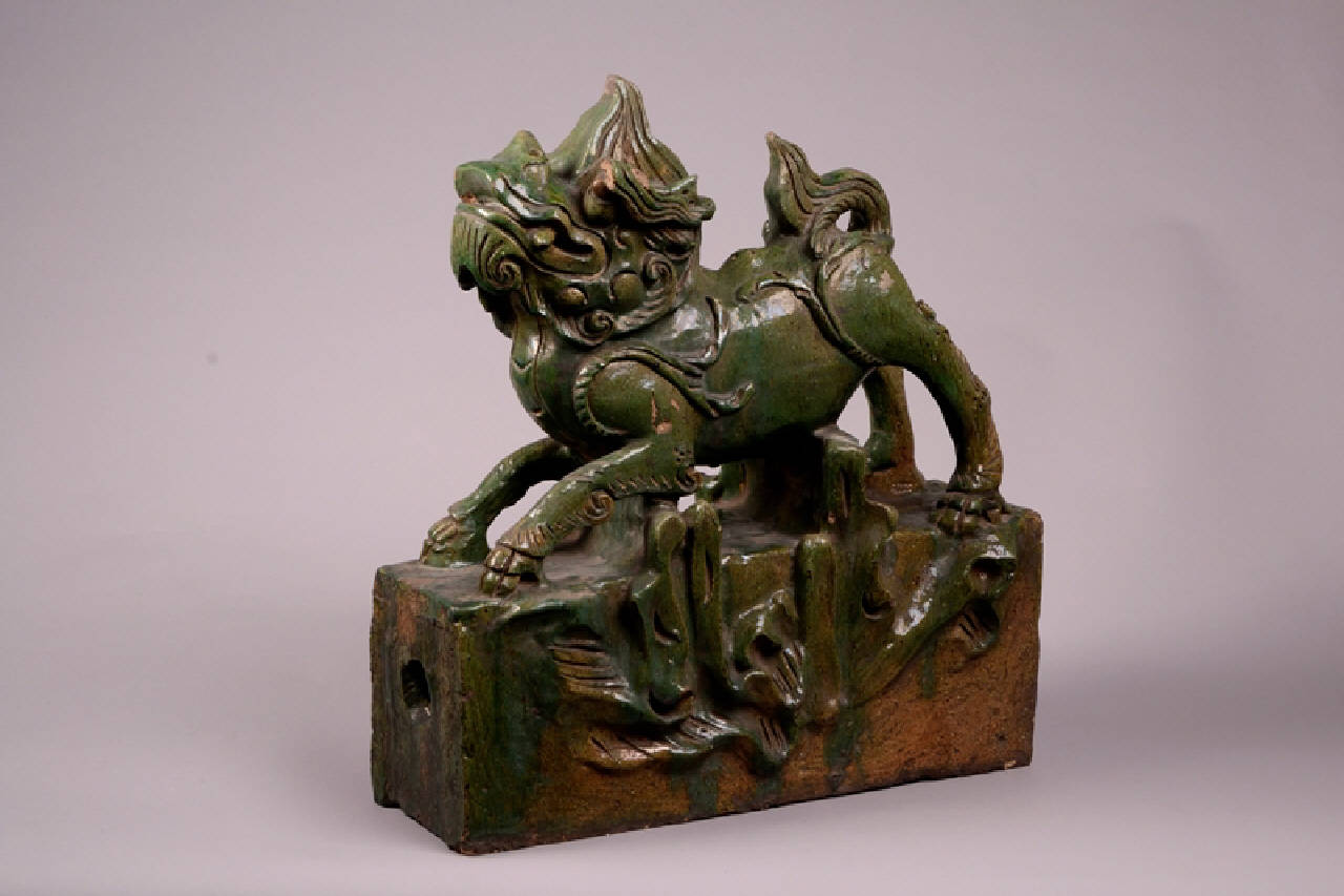Decorazione architettonica raffigurante un animale mitico (difficile da identificare: Xingshi, oppure Suanni o Xiezhi) in terracotta invetrita di verde a forma di chimera con un basamento a parallelepipedo forato con all'esterno motivo di rocce.
