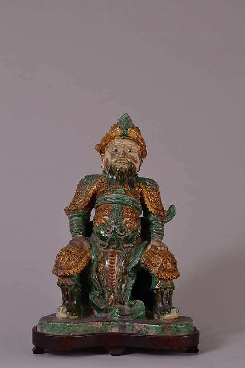 Figura di Guan-di in terracotta invetriata a tre colori, bianco, giallo e verde, di uomo barbuto in vesti da funzionario. La statua, mancante della parte posteriore destra, è stata montata su un supporto in legno con piedini.