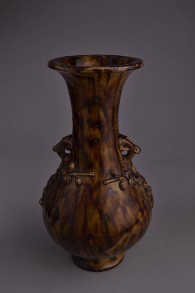 Vaso in terracotta (ceramica) rossa ad invetriatura a carapace di tartaruga. A forma di bottiglia, con piede a tromba e bocca svasata. Due anse e racemi di pruno a rilievo.