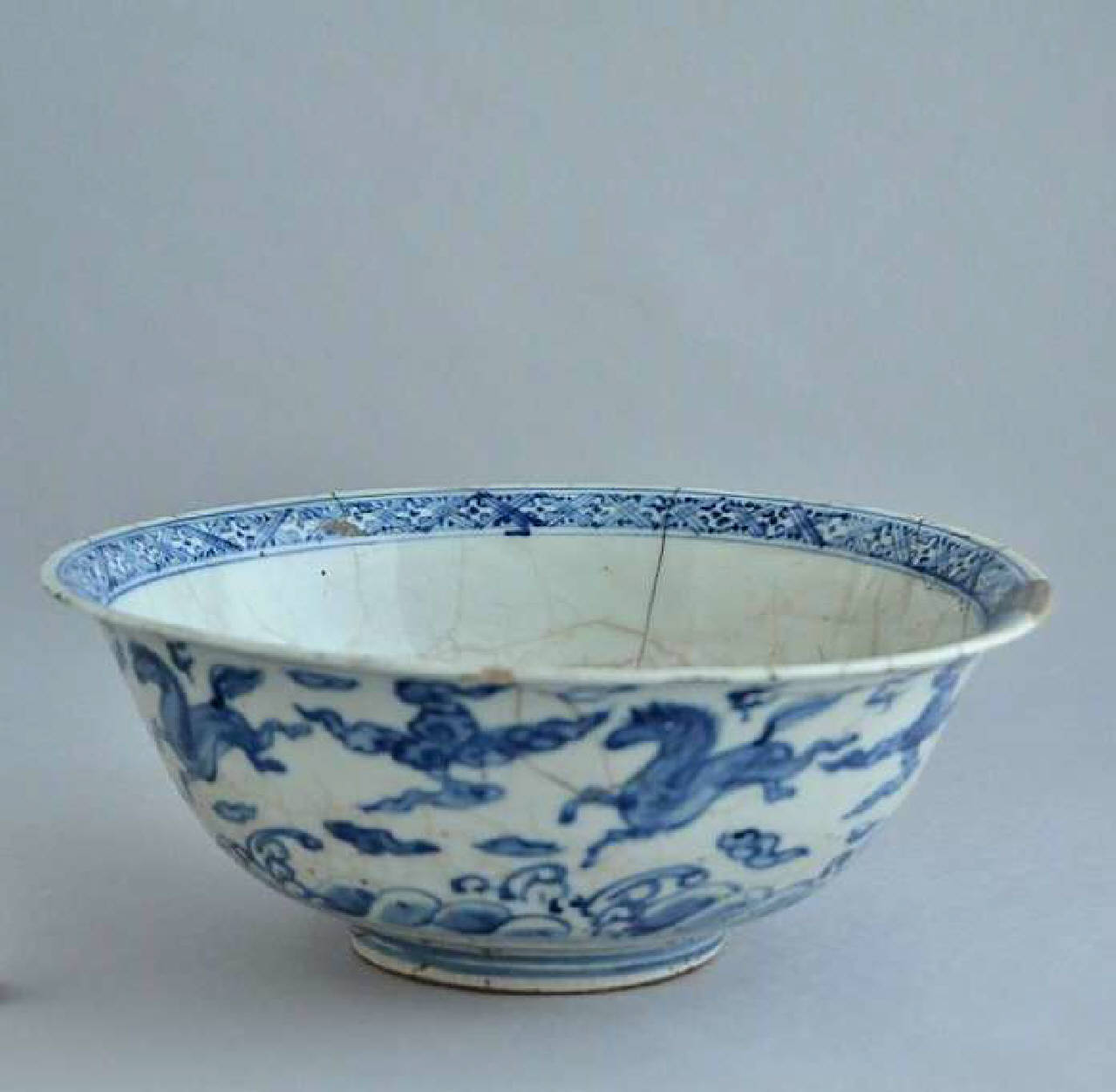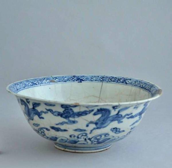 Coppa in porcellana biancoblu con vetrina leggermente craquelè. Decoro interno di fiori di loto entro due cerchi concentrici al centro e fascia a rombi floreali sull'orlo. All'esterno cavalli fra nuvole e onde.