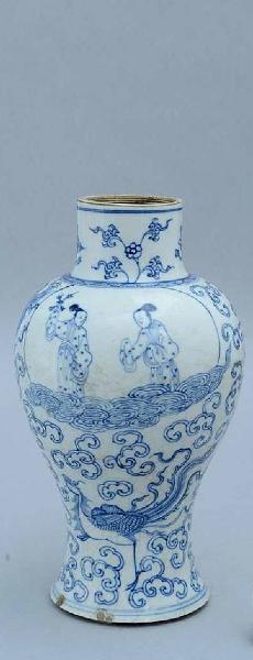 Vasetto a balaustro in porcellana bianca e blu con decorazione di personaggi celesti su nuvolette. Fondo leggermente craquelé. Attorno, fenici e nuvole a forma di fungo sacro. Sul collo la foglia di artemisia