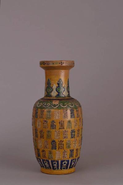 Vaso in porcellana ad invetriatura gialla e smalti policromi, decorato con il motivo dei "mille shou" applicati su tutto il corpo. Alla base marchio inciso Xuantong e del periodo (1909-1912).