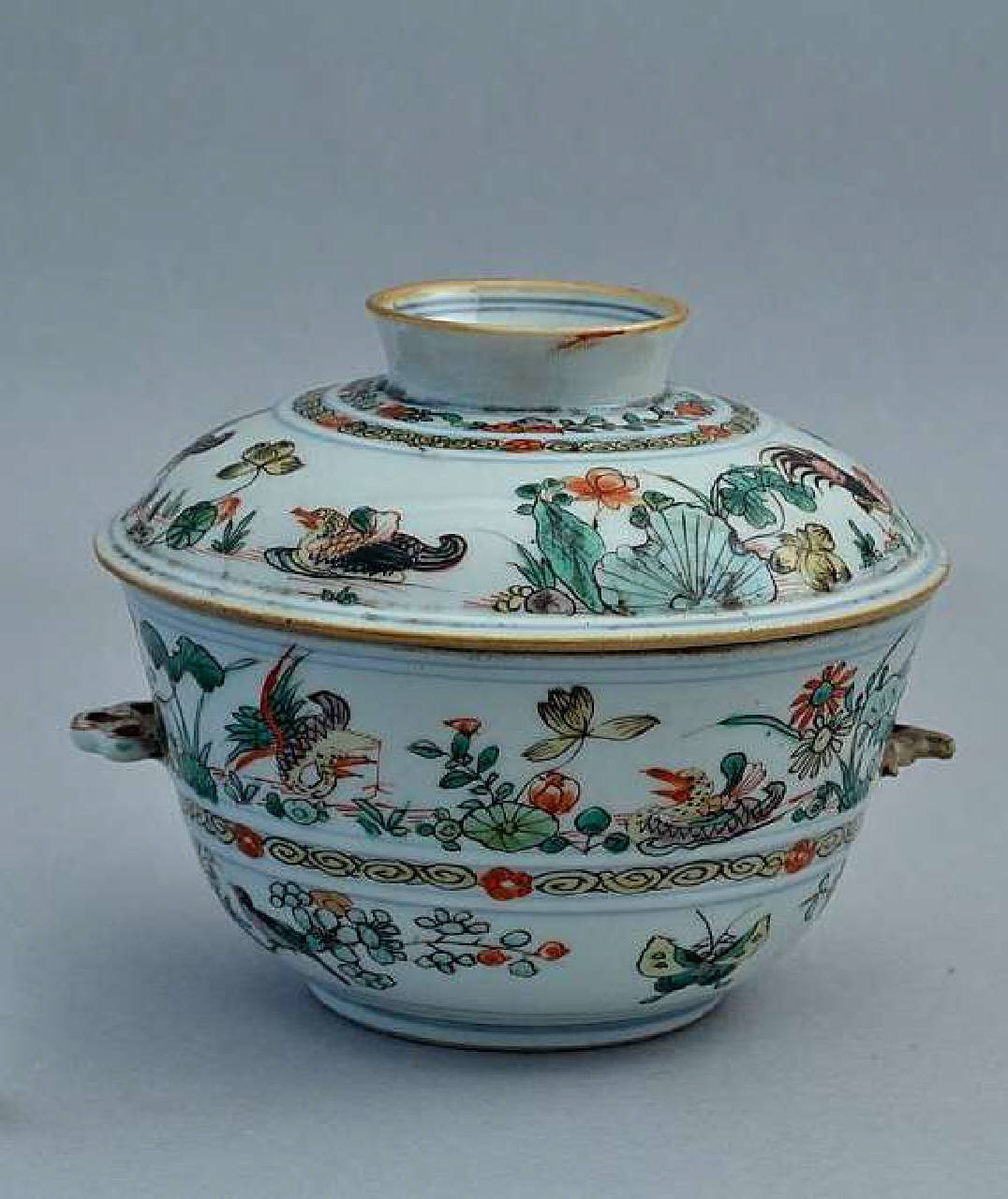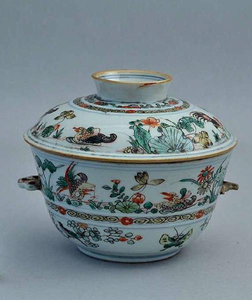 Scodella con due anse a forma di frutto di loto e con coperchio a forma di piattino rovesciato in porcellana Famiglia Verde con dettagli in blu sottocoperta. Decoro di anatre e galli fra la vegetazione. Vicino al basso piede circolare due cerchi concentrici in blu sottocoperta.
