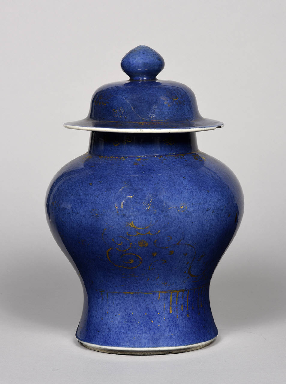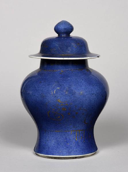 Vaso a giara, panciuto, rastremato in basso, con coperchio a pomolo. Vetrina "blu polvere" monocroma in blu cobalto soffiato chui qing, con decoro floreale e geometrico in oro.
