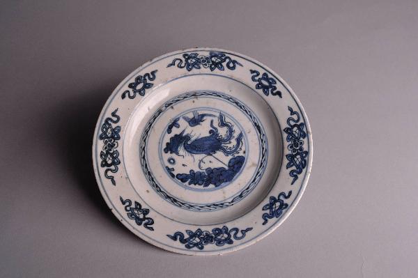 Piattino in porcellana bianca e blu. Il decoro presenta al centro del piatto una fenice feng huang fra fiori e uccelli entro cerchi concentrici e fasce a cornice, e sulla tesa motivo buddista dei rombi lingxing. Su verso, attorno al basso piede, un cerchio blu.