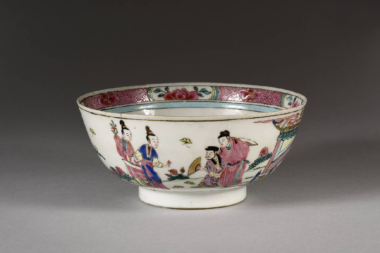Famiglia rosa fencai. Tazza in porcellana a smalti sopracoperta con decoro raffigurante due dame che vengono accolte in giardino da due uomini con vestito da mandarino e ventaglio in mano. All'interno la tazza presenta un fiore centrale e sul bordo una fascia rosa interrotta da quattro cartelle con fiori.