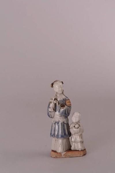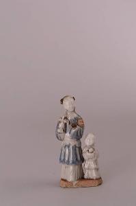 Statuetta in terra dura porcellanosa con coperta bianca e invetriatura nei toni del blu. Sono raffigurati una giovane donna con un cesto nella mano destra, e un bambino sorridente che sta alla sua sinistra. Entrambe le figurine sono attaccate a una basetta non invetriata.