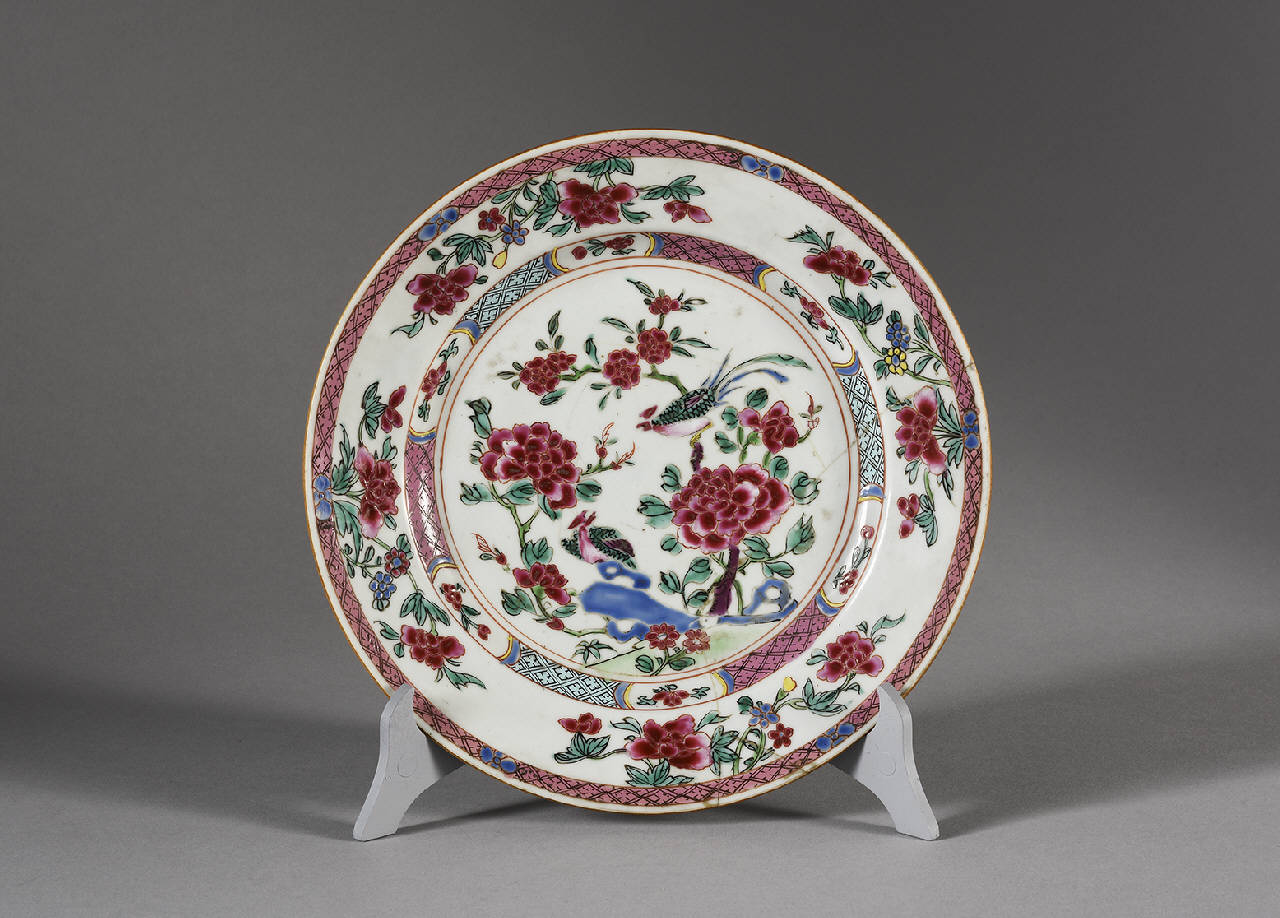 Piatto in porcellana a smalti Famiglia Rosa con decoro centraledi coppia di fenici tra rocce ornametali e rami in fiore, con orlo e fascia interna a motivi geometrici.