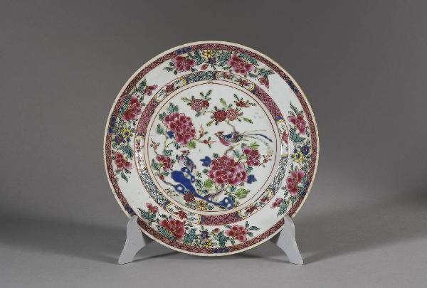 Piatto in porcellana a smalti Famiglia Rosa con decoro centrale di coppia di fenici tra rocce ornamentali e rami in fiore, con orlo e fascia interna a motivi geometrici.