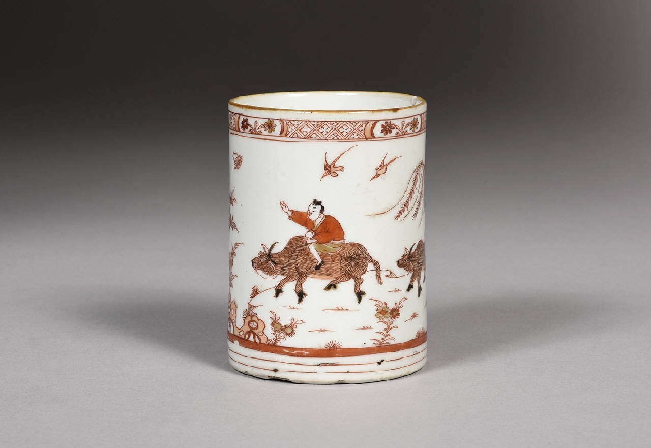 Tazza cilindrica, lievemente ovalizzata, mancante del manico, in porcellana a smalti rosso ferro, seppia e dorature e sopracoperta raffiguranti un un uomo che cavalca un bue seguito da un bovino più piccolo e due uccelli in paesaggio con salice piangente, fiori e rocce ornamentali.