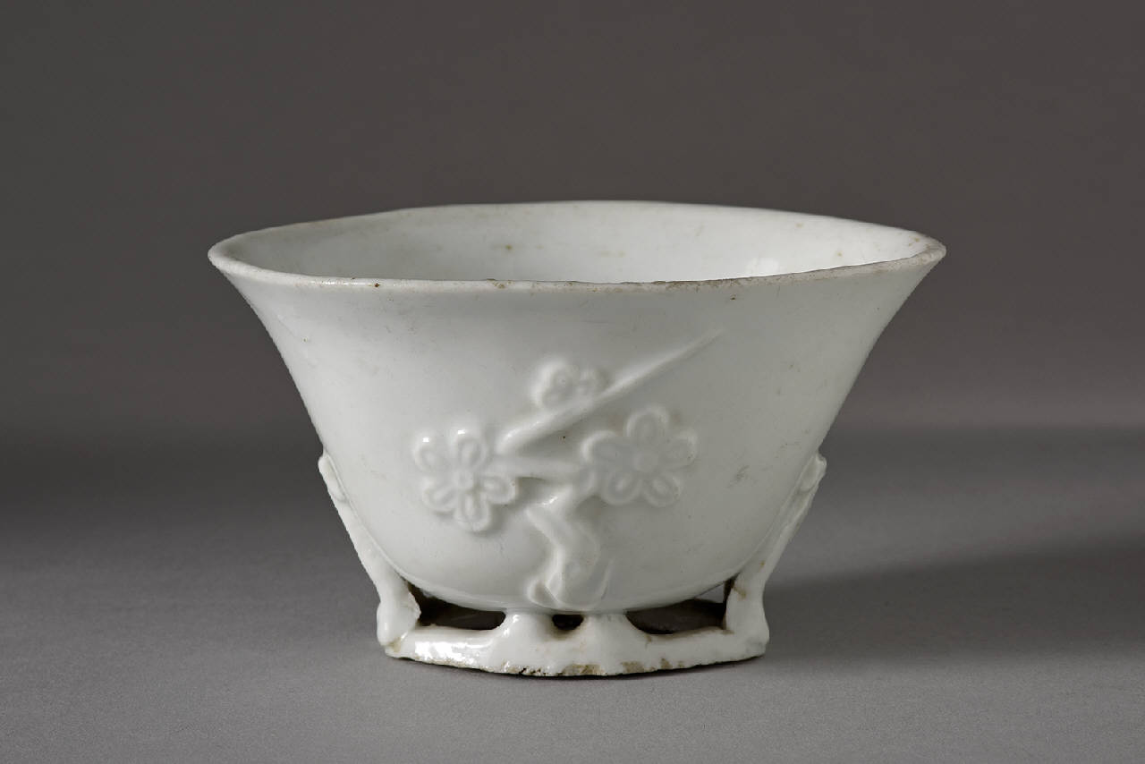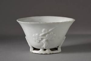 Coppetta libatoria dalla forma ovoidale in porcellana, a invetriatura color bianco latte, con decoro in rilievo di pruno e base a doppio racemo.