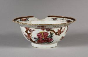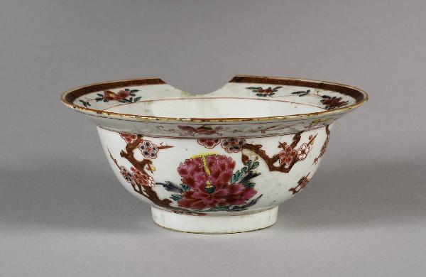 Ciotola dalla forma "klapmuts" (a cappello) in porcellana Famiglia Rosa decorata con ramo di susino in fiore, il bordo con banda a dorature su fondo cafè-au-lait e ulteriori motivi floreali.