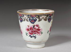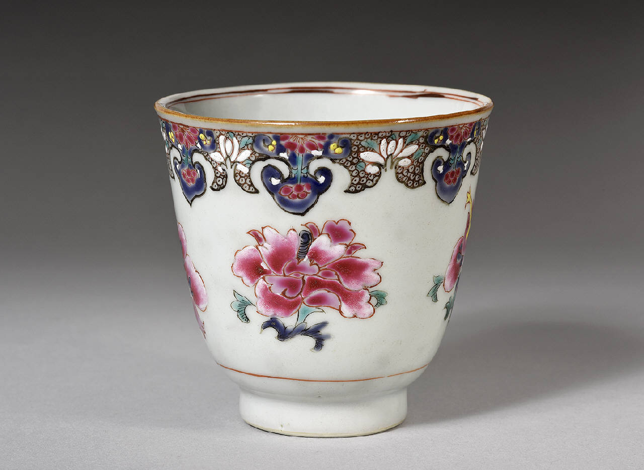 Coppetta in porcellana Famiglia Rosa, decorata con peonia in fiore e bordo a pendenti a motivi geometrici e floreali.
