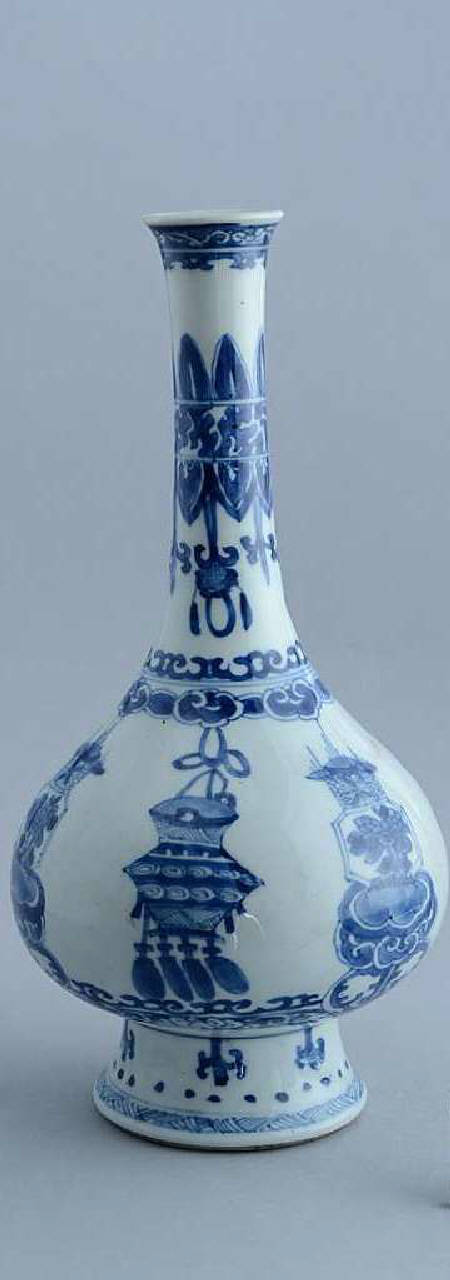Vasetto bianco blu a bottiglia con alto piede a tromba e lungo collo a labbro leggermente espanso. Decorato sul ventre con vasi pendenti, vasi di fiori su tavolino e nappe con cordone. Il lungo collo presenta una doppia fascia di palmette opposte a imitazione del decoro dei bronzi antichi. Sotto, marchio a losanga buddhista entro due cerchi concentrici.