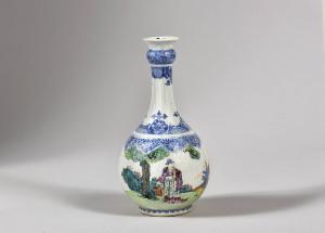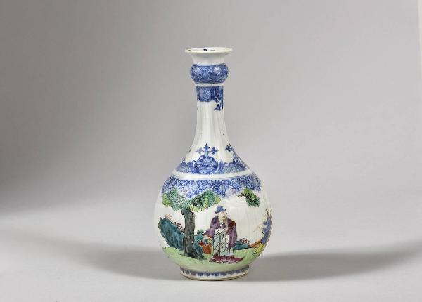 Vasetto suantuoping a bottiglia dal basso piede circolare e lungo collo con rigonfiamento a testa d'aglio terminante a labbro espanso. Decoro in blu sottocoperta sulla spalla, incisoni nascoste anhua su tutto il corpo e disegno a smalti sul ventre raffigurante un uomo e un giovane che raccolgono fiori nelle ceste.