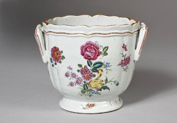 Rinfrescatorio dalla forma ovale e con piede basso, in porcellana a smalti Famiglia Rosa e dorature, con anse e bordo modanato. Decorato al corpo con motivo di rami in fiore.