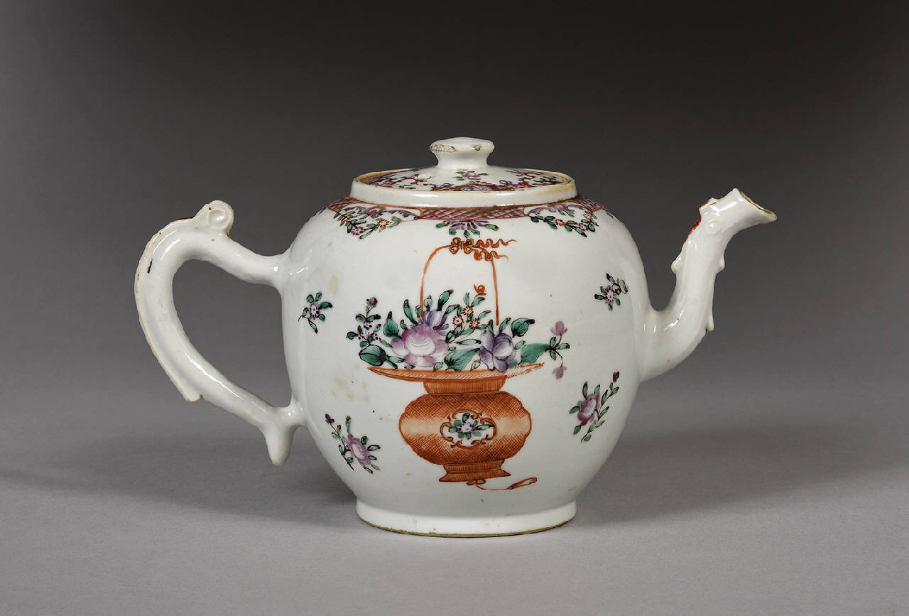Teiera con manico e beccuccio a forma di ramo. Globulare, leggermente rastremata alla base su un basso piede ad anello. Coperchio a pomolo con un forellino. Il decoro in smalti Famiglia Rosa è costituito da vasi di fiori sui lati sinistro e destro del corpo e da fiorellini e racemi sulla spalla e sul ventre. In prossimità della bocca e sul coperchio, decoro ad intreccio di rombi, in rosa.