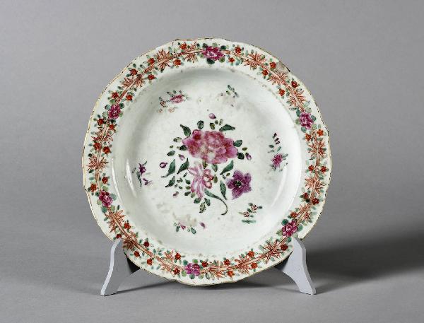 Piatto piano in porcellana policroma con orlo lobato con decoro di peonia in rosa e altri fiori viola. Sulla tesa bambù intrecciato.