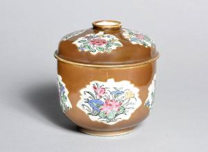 Grande ciotola con coperchio della tipologia Famiglia Rosa "Batavia". Decorata con cartelle a guisa di foglie decorate a motivi floreali accompagnate da pesche ornamentali, su fondo café-au-lait.