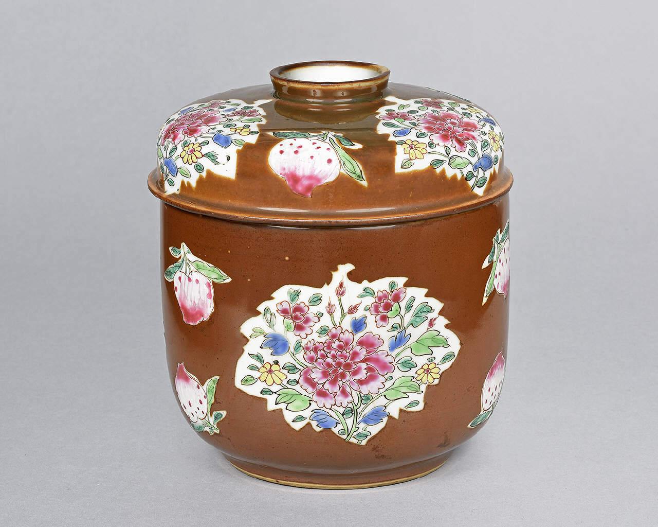 Grande ciotola con coperchio della tipologia Famiglia Rosa "Batavia". Decorata con cartelle a guisa di foglie decorate a motivi floreali accompagnate da pesche ornamentali, su fondo café-au-lait.