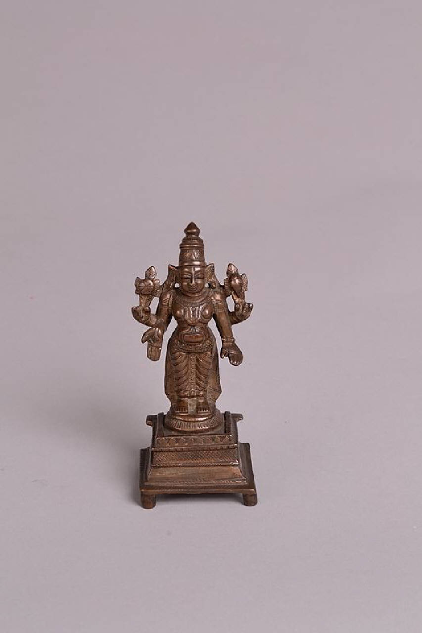 India. Visnu (?) a quattro braccia stante. Le mani superiori reggono entrambe una palmetta, le inferiori sono abbassate con i palmi aperti. Poggia su un basamento circolare a piani sovrapposti con quattro piedini.
