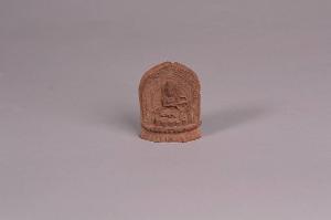 Tibet. Cretula votiva sha tcha tcha in terra cotta rossa scurita frontalmente raffigurante un Buddha assiso sul trono di loto in padmasana, con la mano destra che compie il gesto di rinuncia sramanamudra e la sinistra nel gesto dell'esposizione della dottrina vitarkamudra. Iscrizioni graffite in cinese sul lato posteriore.