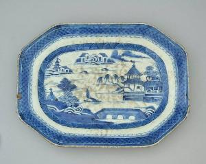 Vassoio a forma rettangolare con angoli smusati e modanati. Porcellana biancoblu. Decorazione centrale di paesaggio lacustre con pagode. Attorno fascia a motivo di onde, e sulla tesa motivi geometrici.