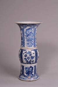Vaso bianco e blu cilindrico con rigonfiamento nel mezzo e bocca a tromba. Decorato a cartelle con all'interno i fiori classici delle stagioni. In coppia con C744.
