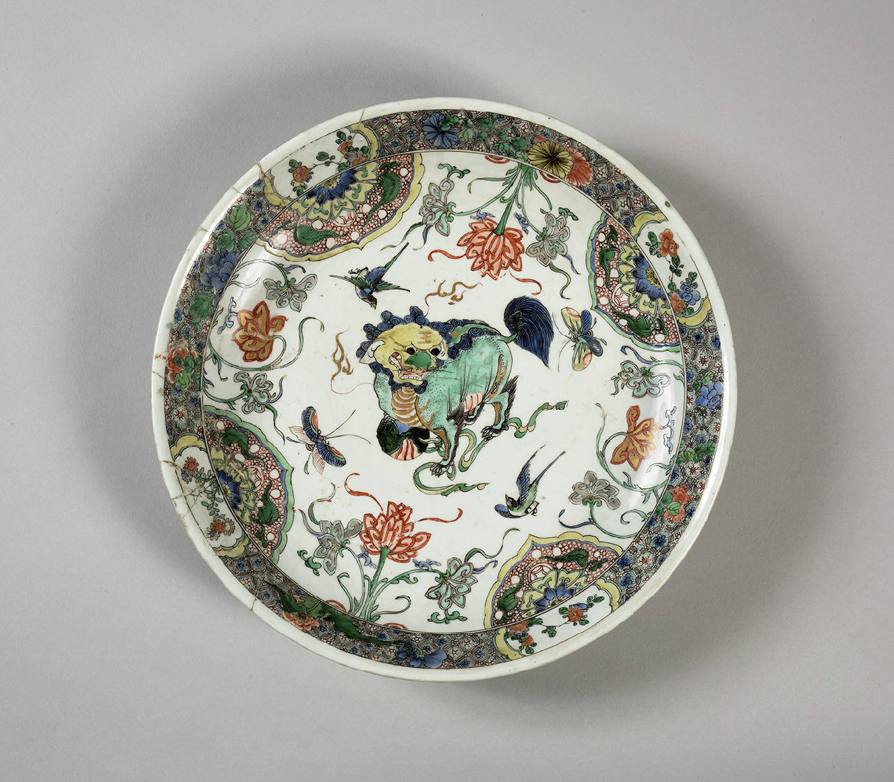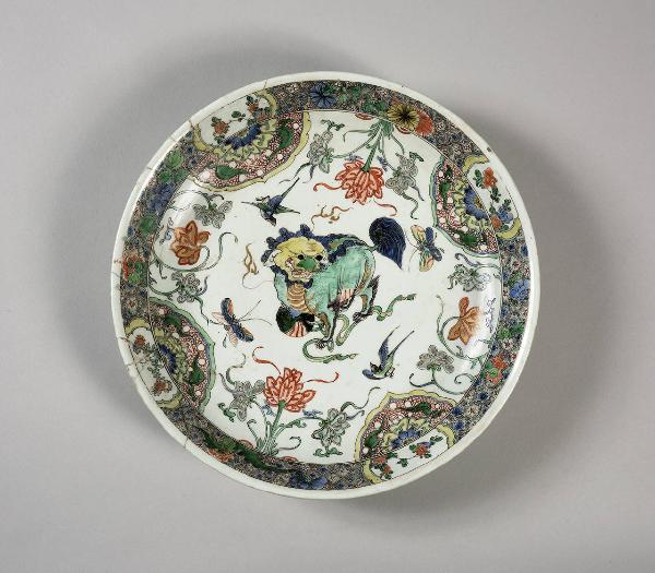 Grande piatto decorato a smalti sopracoperta nella cromia della famiglia verde con motivo di leone buddhista con la palla di broccato e attorno farfalle uccelli e fiori.