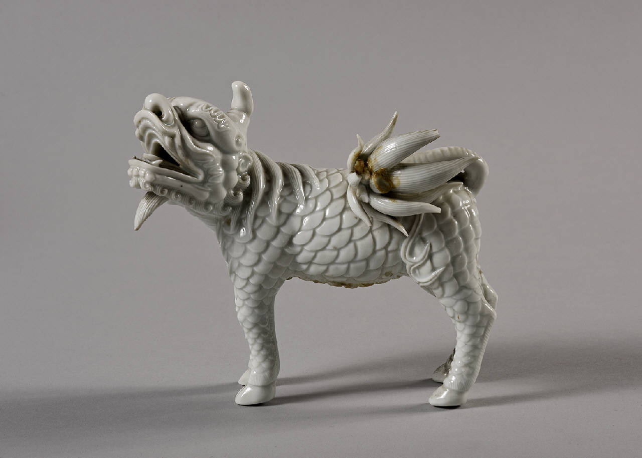 Qilin che guarda alla sua sinistra in porcellana monocroma bianca raffigurata stante, le fauci aperte. In coppia con C658.
