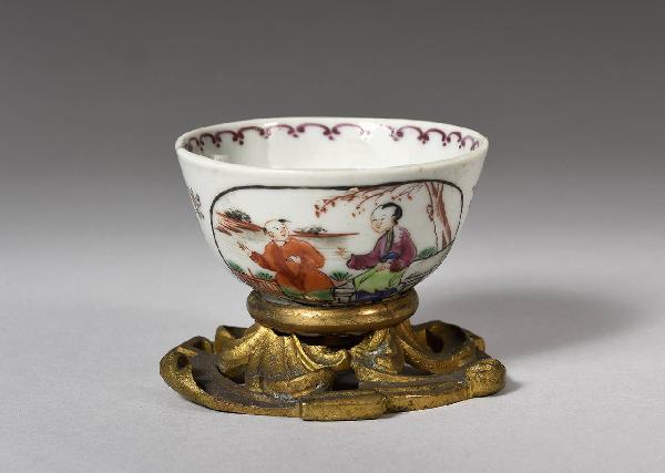 Famiglia Rosa. Tazzina in porcellana a forma di coppetta con basso piede circolare. Montata su una basetta occidentale in bronzo dorato a motivo di foglie. Decoro entro cartelle ovali di donna con bambino e donna con ventaglio all'esterno di un'abitazione.
