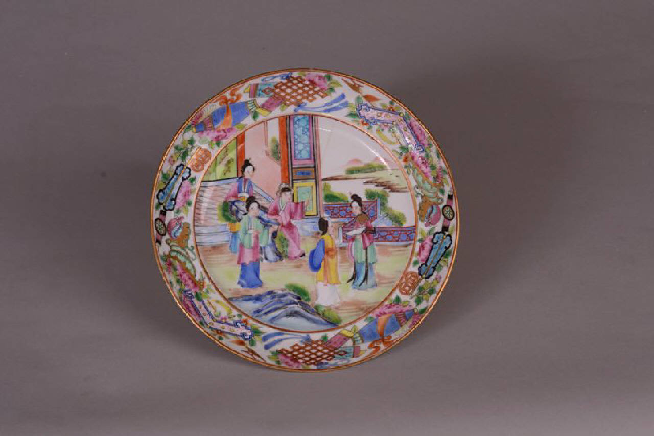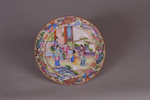 Piatto decorato in stile cantonese a smalti policromi sopracoperta. Famiglia rosa. Parte di un servizio di 6 piatti (rimanenti?) con decoro sulla tesa di simboli beneaugurali, "i cento oggetti antichi", e parte centrale raffigurante una scena parte del racconto rappresentato su tutto il servizio. Il racconto riguarda l'incontro fra divinità celesti e umani. In questo piatto è rappresentato un uomo seduto ad un tavolo, formato da un tronco d'albero nel suo giardino, che indica qualcosa alle quattro dame che gli stanno attorno.