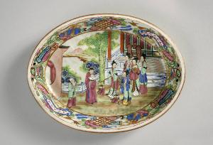 Vassoio ovale con parete alta espansa. Decoro a smalti cantonesi di dame in processione con lanterne, di fronte a loro due uomini dei quali uno con ventaglio. Sulla parete interna decorazione di simboli augurali "cento oggetti antichi".