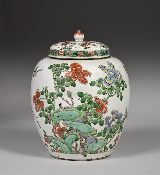 Potiche in porcellana a decorazione policroma con decoro a smalti nei colori della famiglia verde (wucai) verde, giallo, blu, viola e rosso.Coperchio con pomolo a forma di bulbo. Decorazione di fiori, fra i quali la peonia, mudan, il crisantemo, ju, uccelli e rocce, taihu. Il disegno è contornato in nero.
