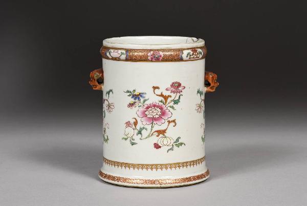 Boccale in porcellana a smalti Famiglia Verde-Imari, a forma di boccale in porcellana con due anse forate a protome di mostro fantastico. Decorazione a fiori classici su un lato e stemma del Conte Michel-Nicolas Judde (Rouen 1694 - 1770). In coppia con C697