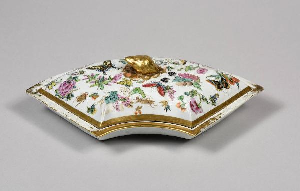 Famiglia Rosa. Parte a forma di ventaglio di compostiera formata da quattro pezzi (C699, C698, C701, C702) come questo e una parte circolare centrale. Tutti con rispettivo coperchio bombato e pomo a forma di pigna su una foglia in leggero rilievo. Decorazione di fiori, farfalle e insetti. Doratura.