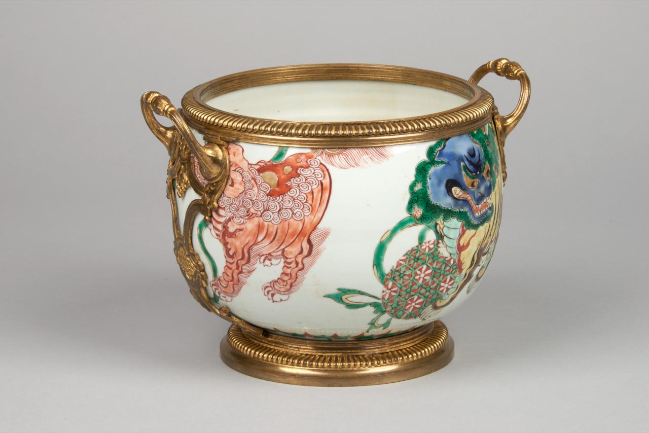 Potiche in porcellana Famiglia Verde, il corpo globulare, decorata con quattro leoni buddhisti, di cui due con palla di broccato. Con montatura biansata in bronzo dorato di manifattura europea. Uguale a C704