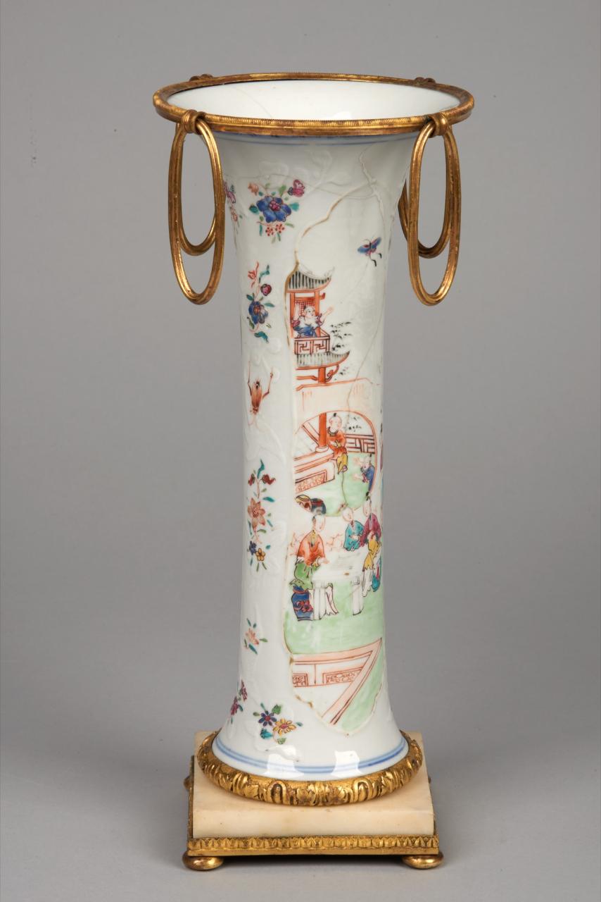 Vaso a tromba in porcellana invetriata e decoro a rilievo e in smalti Famiglia Rosa sopracoperta, organizzato in cornici ovali sagomate in rilievo con adulti e fanciulli in giardini e padiglioni, contornate da motivi floreali sparsiLa porcellana è montata su con piedistallo quadrato in marmo con fondo in bronzo dorato a quattro piedini bassi e rotondi. Il labbro è contornato da un bordo in ottone dal quale pendono quattro anelli ovali.
