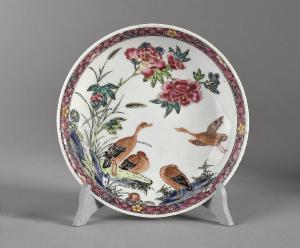 Piattino con decoro negli smalti della Famiglia Rosa di anatre selvatiche alcune accovacciate, altre in volo, vicino a rami di peonie in fiore.
