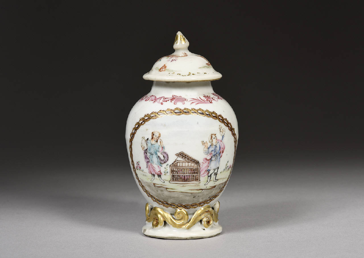 Contenitore da tè con scena allegorica "cuore in gabbia". Forma ridotta di potiche a sagoma ovoidale con breve collo cilindrico, piccolo coperchio a calotta e piede ornato da girali fitomorfe a giorno dorate. Famiglia rosa. Decorazione in stile occidentale con due personaggi e una cesta con dentro un cuore. Sul retro dei fiori.