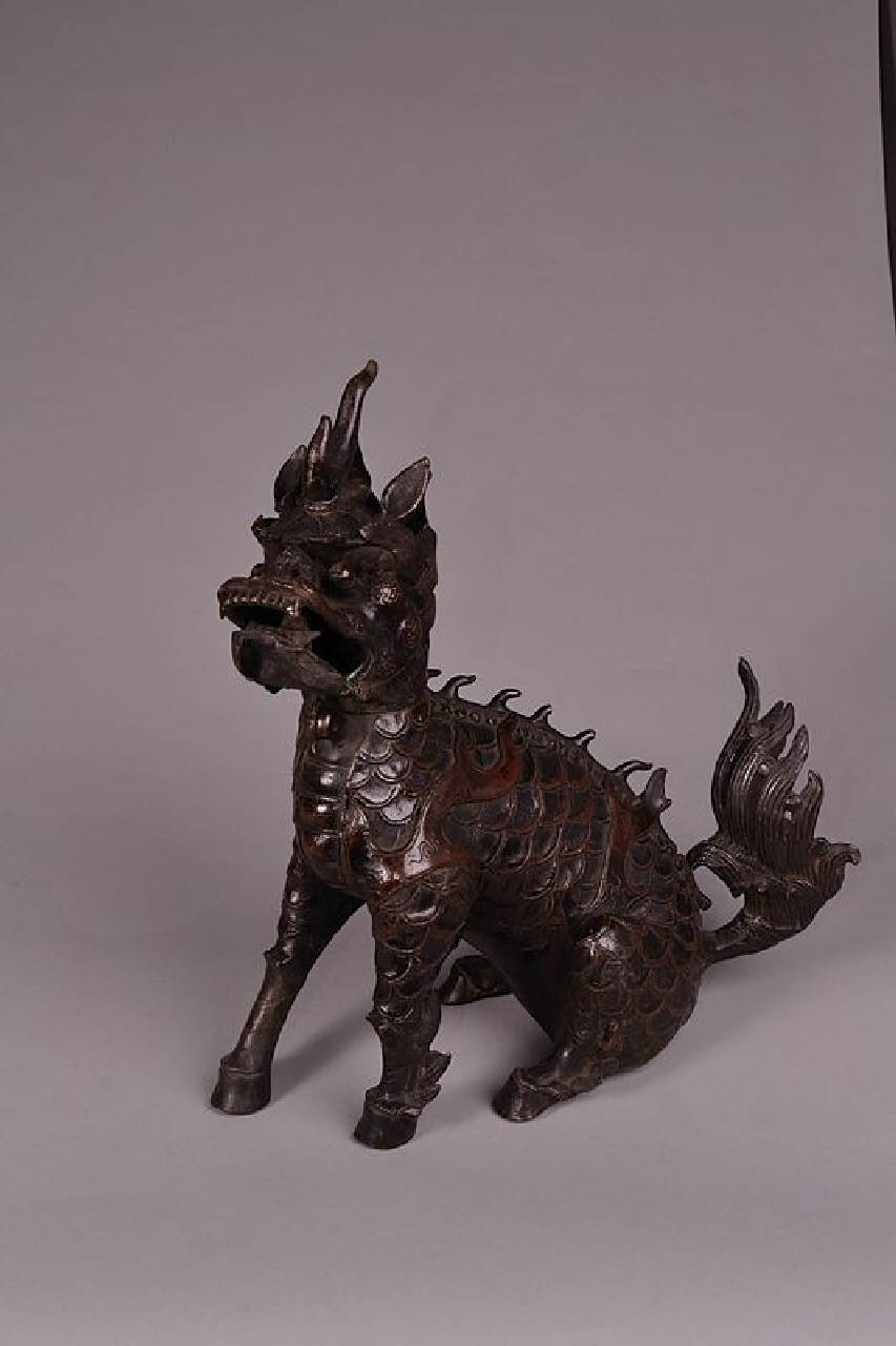 Incensiere a forma di grande qilin in poszione seduta, il copro coperto da squame, il volto dall'espressione minacciosa con folta crineria sormontato da unico corno centrale.