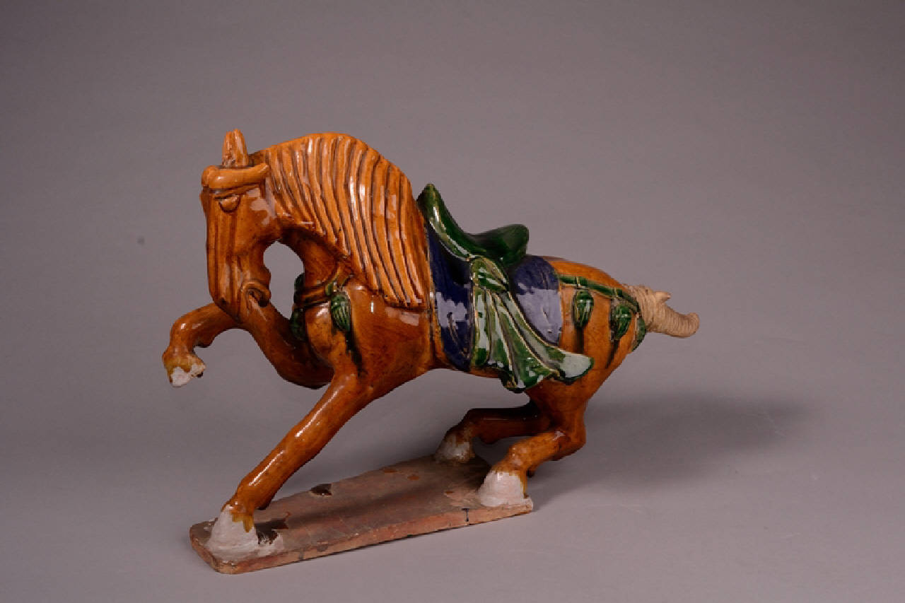 Cavallo con basamento in terracotta rossa invetriata in blu, verde e bianco su fondo ambra. L'animale è riprodotto leggermente impennato con la zampa anteriore destra alzata e le due zampe dietro piegate. La coda, non invetriata è in materiale diverso, sembra aggiunta.