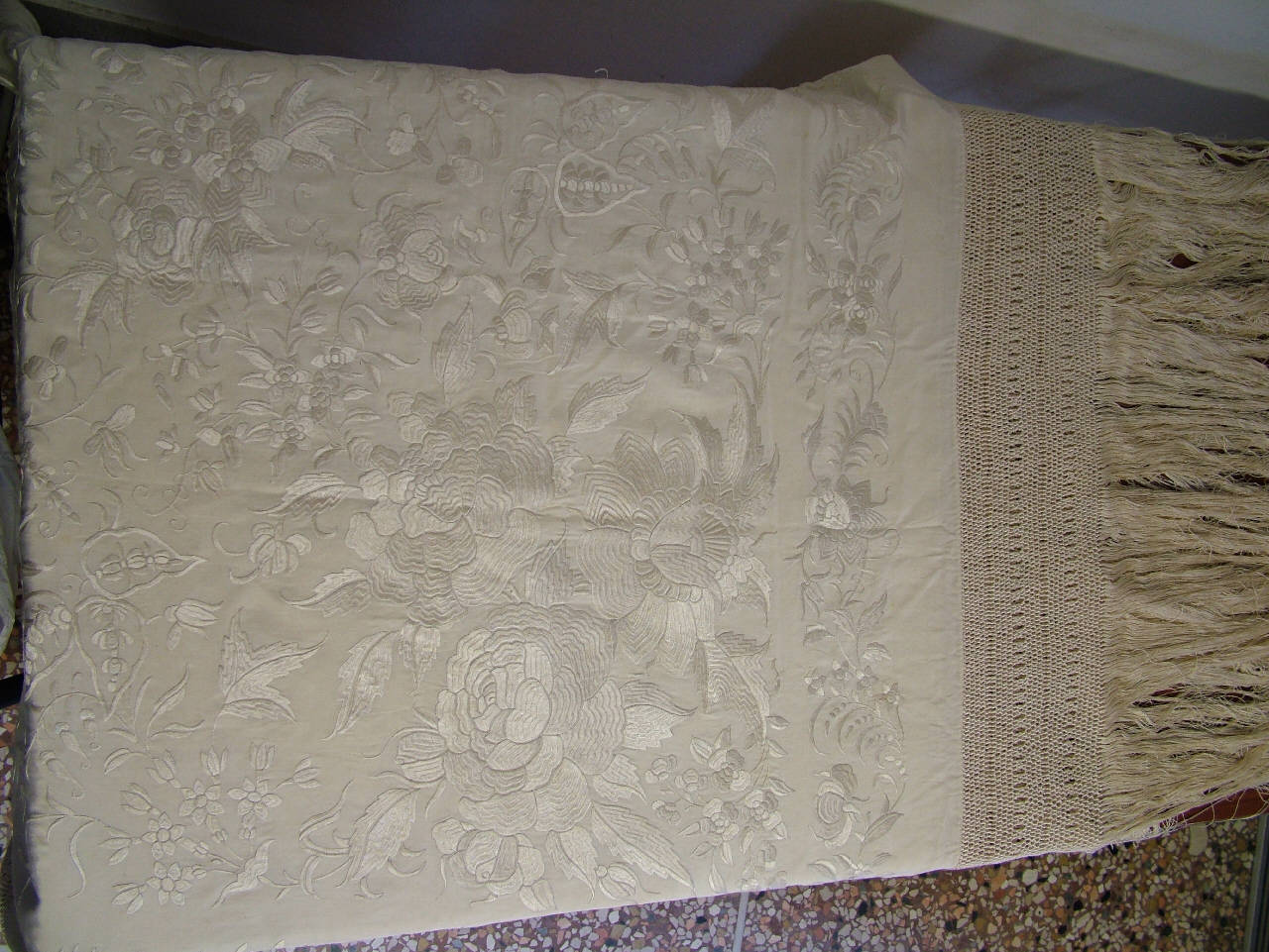 Grande scialle di seta color avorio con decorazione centrale a motivi floreali stilizzati e ampia bordura a giorno terminante in lunghe sfrangiature annodate a mano.