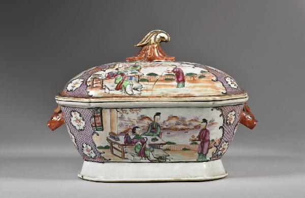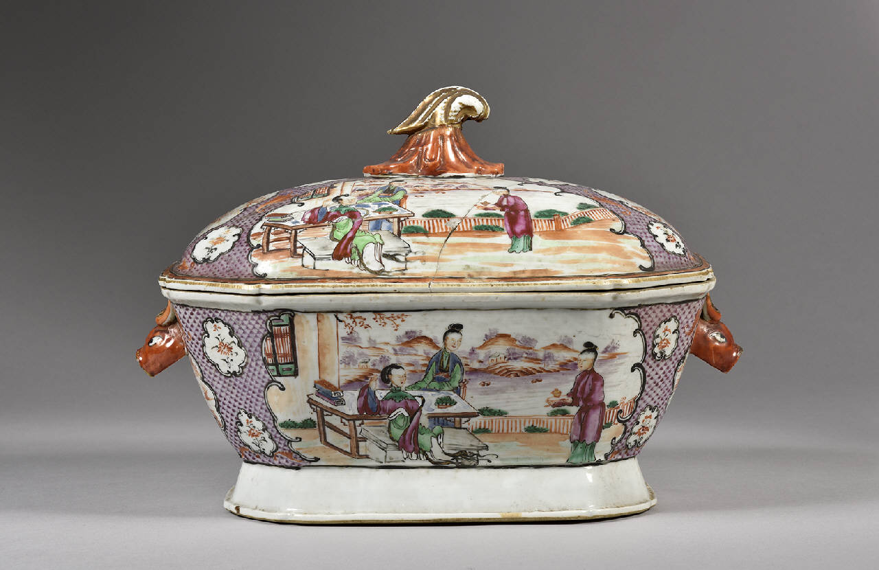 Grande zuppiera con coperchio. Decoro in stile Famiglia Rosa cantonese a smalti color lavanda, rosso ferro e dorature, con anse a forma di protomi di conghiale e pomolo dorato fitomorfo. In un giardino una nobildonna seduta su una panca è assistita da due dame, una delle quali le porge una tazza su un vassoio. Lo sfondo, di rombi color lavanda con puntino a un vertice, è interrrotto da cartigli a nuvola con immagini stilizzate di paesaggio e decoro floreale.