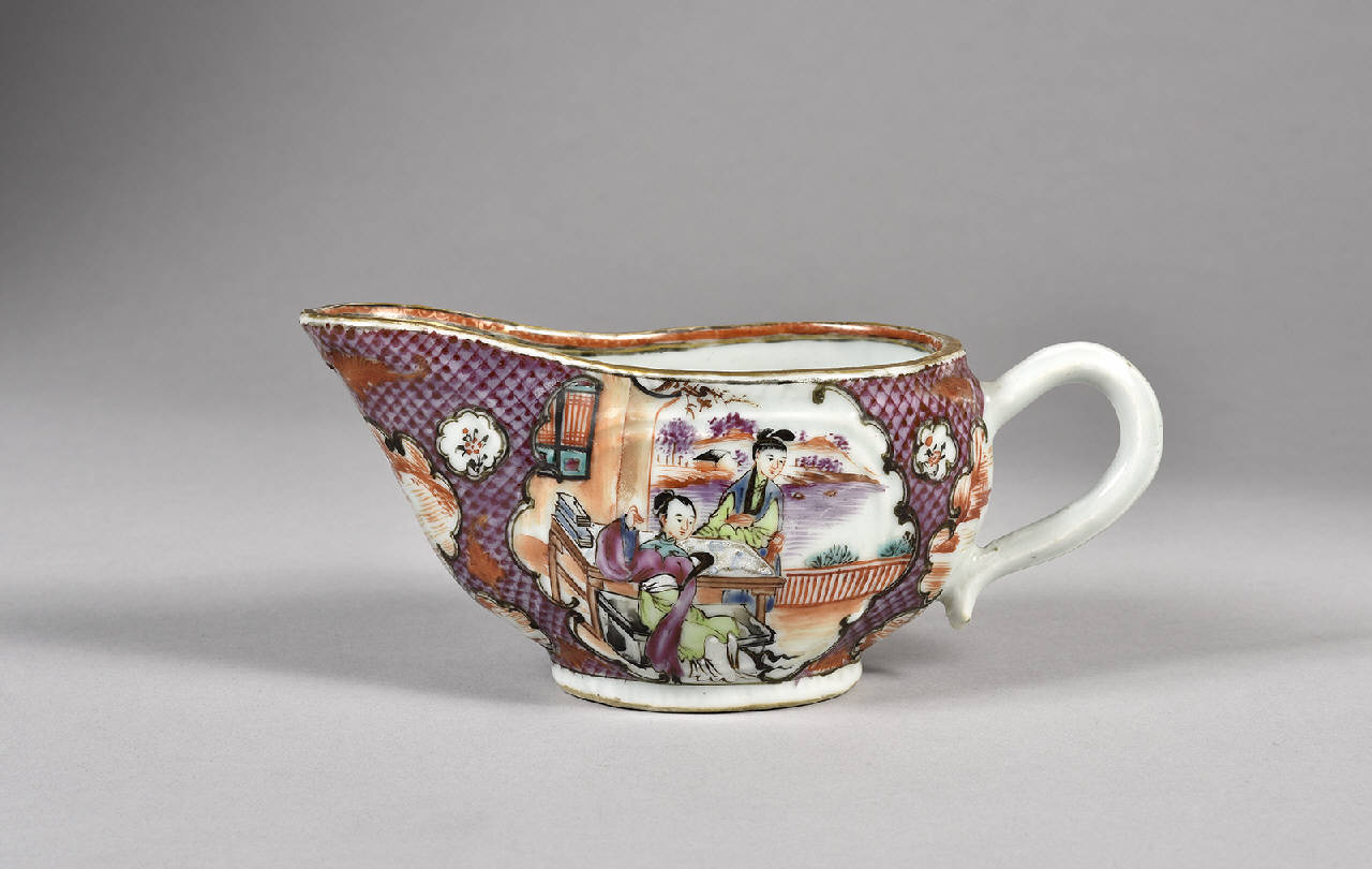 Salsiera.\nDecoro in stile cantonese a smalti color lavanda: in un giardino una nobildonna seduta su una panca è assistita da due dame, una delle quali le porge una tazza su un vassoio.\nLo sfondo, di rombi color lavanda con puntino a un vertice, è interrrotto da cartigli a nuvola con immagini stilizzate di paesaggio e decoro floreale.