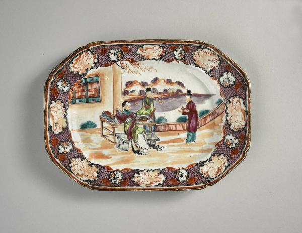 Vassoio piccolo.\nDecoro in stile cantonese a smalti color lavanda: in un giardino una nobildonna seduta su una panca è assistita da due dame, una delle quali le porge una tazza su un vassoio.\nLa tesa ha uno sfondo di rombi color lavanda con puntino a un vertice interrrotto da cartigli a nuvola con immagini stilizzate di paesaggio e decoro floreale.