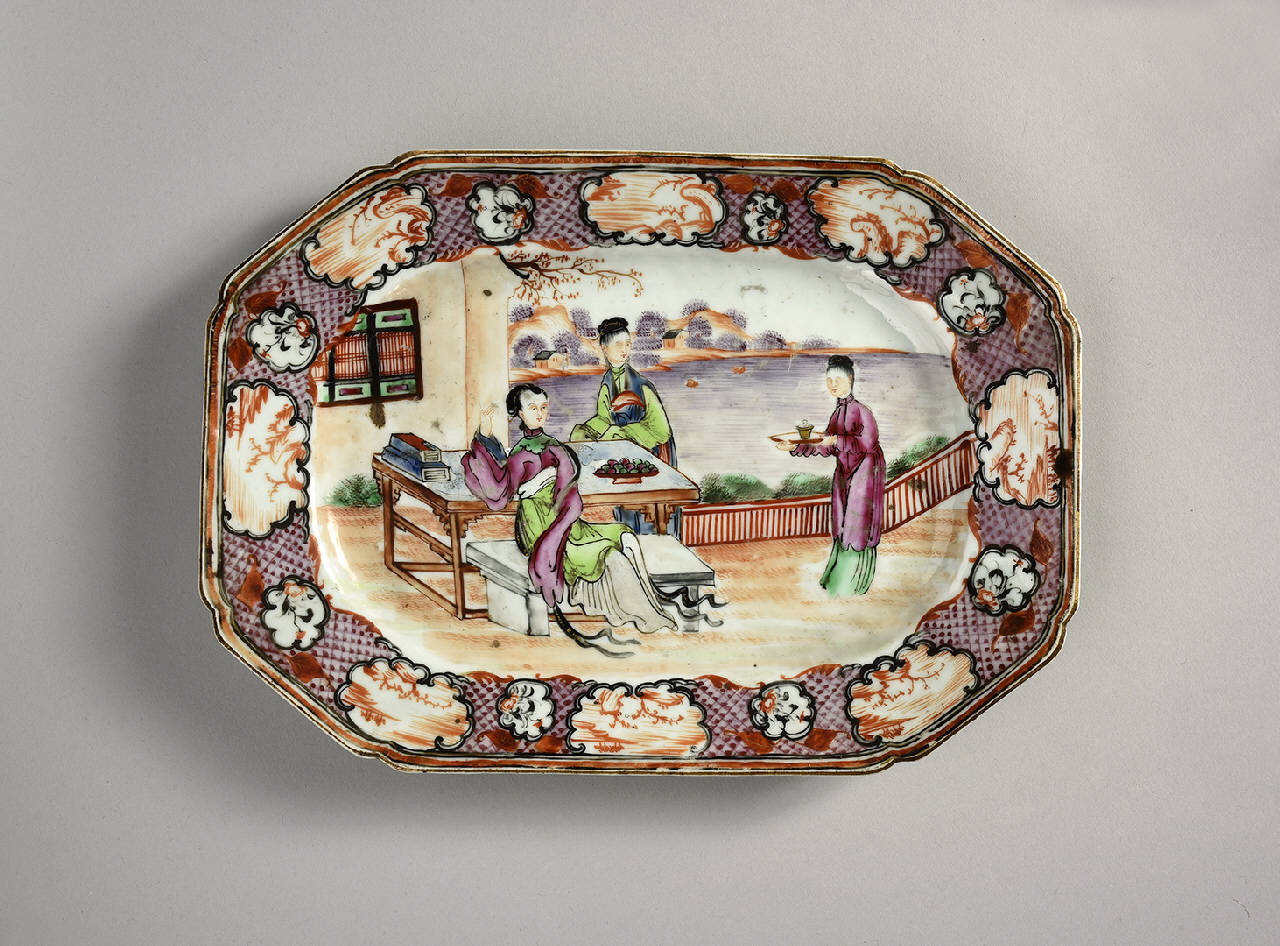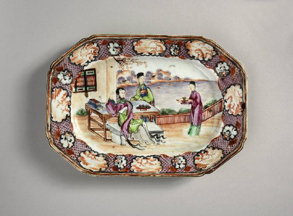 Vassoio piccolo.\nDecoro in stile cantonese a smalti color lavanda: in un giardino una nobildonna seduta su una panca è assistita da due dame, una delle quali le porge una tazza su un vassoio.\nLa tesa ha uno sfondo di rombi color lavanda con puntino a un vertice interrrotto da cartigli a nuvola con immagini stilizzate di paesaggio e decoro floreale.