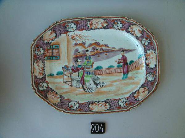 Vassoio medio.\nDecoro in stile cantonese a smalti color lavanda: in un giardino una nobildonna seduta su una panca è assistita da due dame, una delle quali le porge una tazza su un vassoio.\nLa tesa ha uno sfondo di rombi color lavanda con puntino a un vertice interrrotto da cartigli a nuvola con immagini stilizzate di paesaggio e decoro floreale.