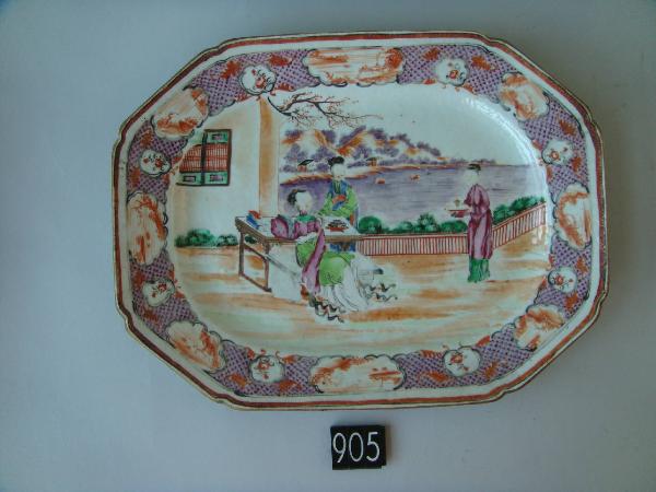 Vassoio medio.\nDecoro in stile cantonese a smalti color lavanda: in un giardino una nobildonna seduta su una panca è assistita da due dame, una delle quali le porge una tazza su un vassoio.\nLa tesa ha uno sfondo di rombi color lavanda con puntino a un vertice interrrotto da cartigli a nuvola con immagini stilizzate di paesaggio e decoro floreale.