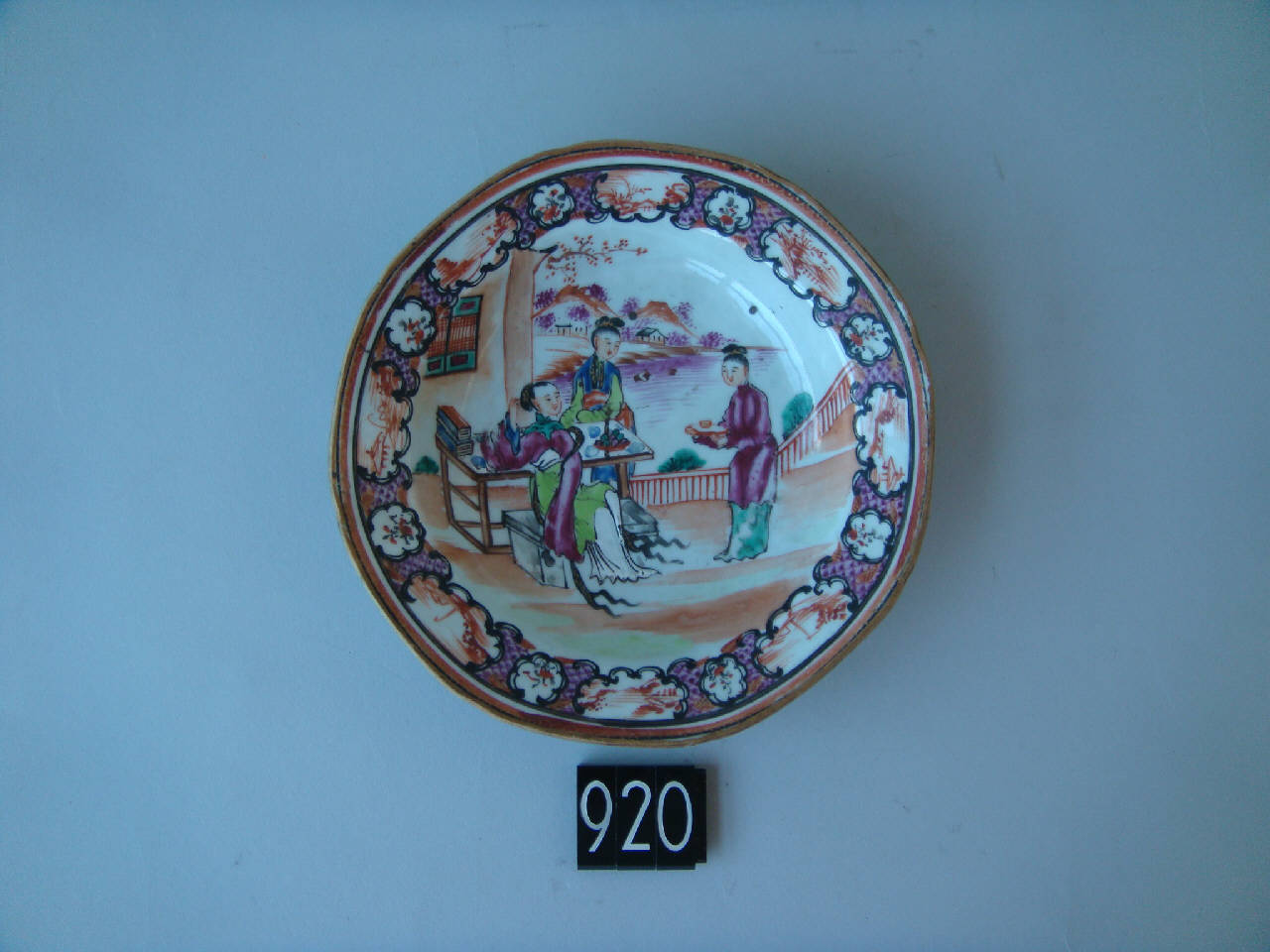 Ciotola ottagonale.\nDecoro in stile cantonese a smalti color lavanda: in un giardino una nobildonna seduta su una panca è assistita da due dame, una delle quali le porge una tazza su un vassoio.\nLa tesa ha uno sfondo di rombi color lavanda con puntino a un vertice interrrotto da cartigli a nuvola con immagini stilizzate di paesaggio e decoro floreale.
